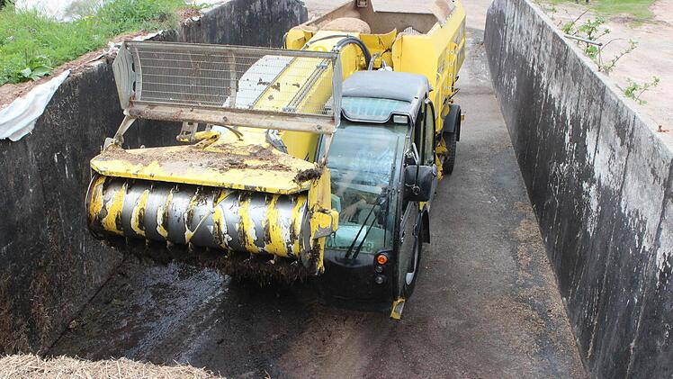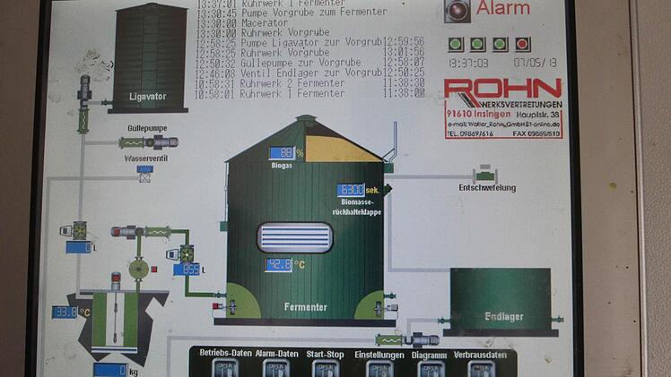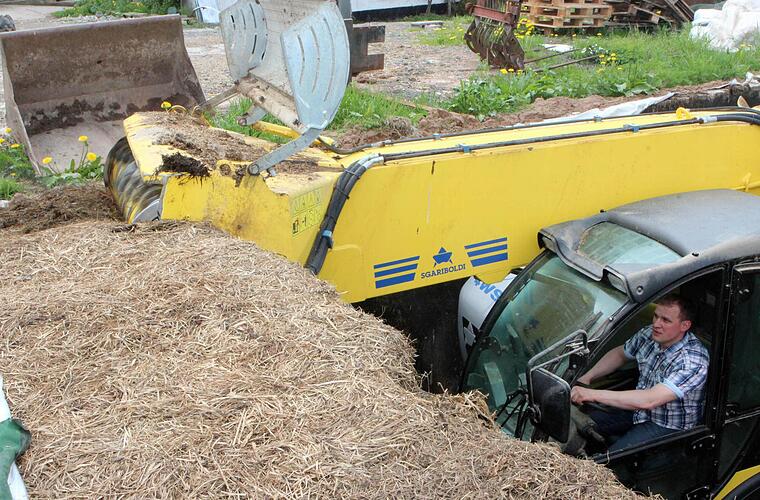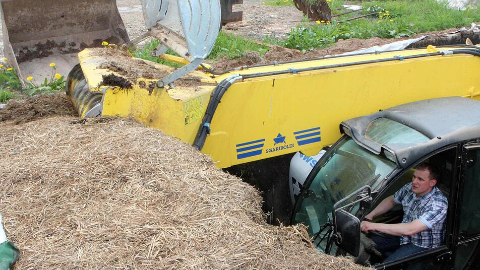 Die Motoren stehen in einem unscheinbaren Gebäude neben der Vorgrube. Diese misst sieben Meter im Durchmesser und drei Meter in der Tiefe. Dort wird die Biomasse gerührt und vorfermentiert, bevor sie durch einen Häcksler in den Fermenter zur Gasgewinnung gepumpt wird.