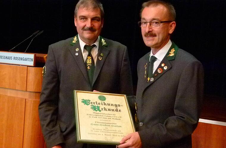Oberschützenmeister Hans-Herbert Hartan hat schon alle Ehrungen erfahren. So musste eine neuartige Auszeichnung erst "erfunden" werden. Anlässlich der Schützentafel im Kongresshaus konnte 1. Schützenmeister Stefan Stahl das Geheimnis lüften.