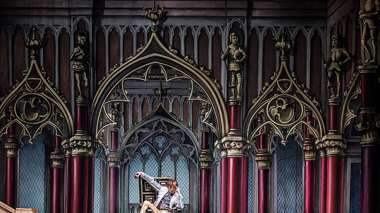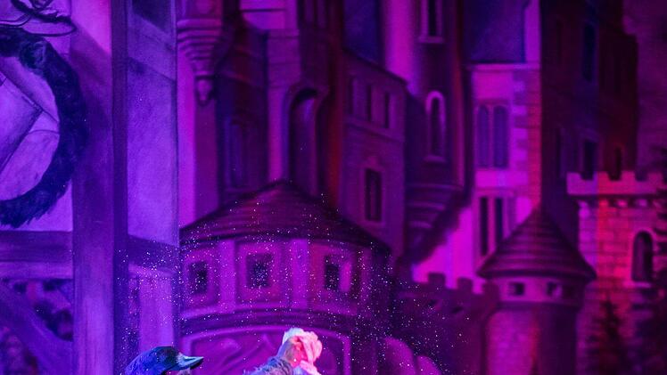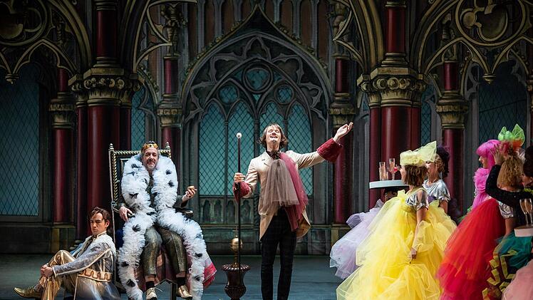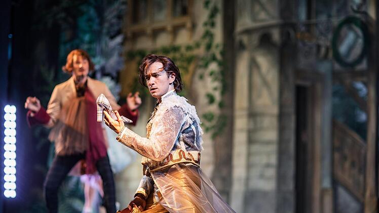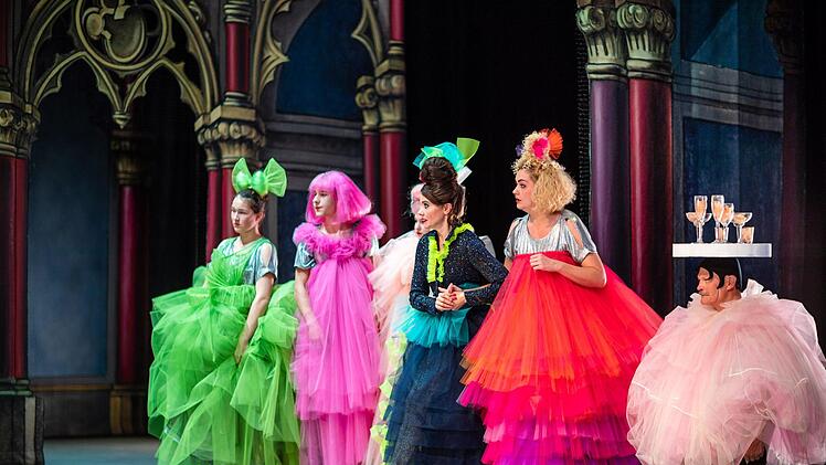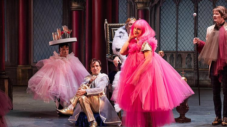 Carola Volles wiederum lässt die ironisierte Märchengesellschaft aus guten und bösen Menschen und sprechenden Tieren in rauschendem, farbenprächtigen Tüll aufmarschieren. Oder herbeiflattern. Oder die Figuren schweben und springen in den originellen Minichoreografien von Mark McClain. Was braucht es da echte Pferde; dieser Prinz reitet doch auch ohne wie die Leidenschaft in Person - von links nach rechts und zurück durch die Kulissen. Gefolgt von seinem höchst skurrilen Lehrer (Alexander Tröger).