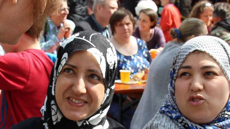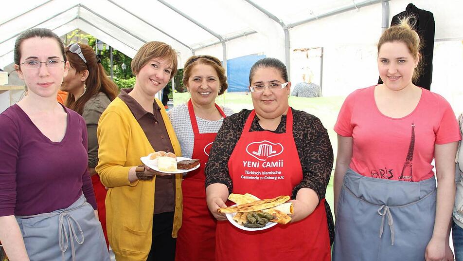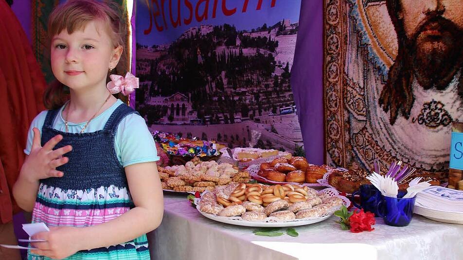 Da wird gemeinsam gegessen und von den Tellern des Gegenübers probiert. Da wird gelacht, und die Posaunenspielerin holt sich einen Rat bei den beiden jungen Frauen mit Kopftuch. Im Zelt der russisch-orthodoxen Gemeinde duftet es nach süßem Gebäck, das ganz fein auf Tabletts arrangiert ist. Dahinter springen russische und türkische Kinder durch den Springbrunnen, am Rande unterhalten sich Männer mit langen Bärten mit solchen, die ein Kreuz um den Hals tragen.