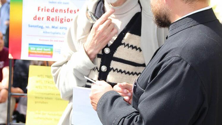 Auf der Bühne folgt den Worten Musik. Auf dem Programm: Posaunenchor St. Moriz, Chor der Buddhistinnen, Kinderchor St. Marien, Jugendchor "Stimmenmeer", Jüdischer Synagogenchor Bamberg, Friedensrap, Klangrohre, Tanzgruppe der Moschee, Chor der Imame und jeder der mitmachen möchte.