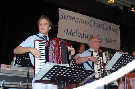 Da wunderte es, dass der vor 40 Jahren gegründete Seemannschor leider Nachwuchsprobleme hat und händeringend junge Sänger sucht. „Das Durchschnittsalter liegt bei 60 Jahren,“ verriet Apfel. Für interessierte Sänger (und Sängerinnen) stehen jeden Montag ab 19 Uhr die Türen der Kajüte in Ketschendorf (ehemaliges SVK-Sportheim im Schlosspark) weit offen. Der älteste Sänger im Chor, Richard Scherf ist übrigens 75 Jahre alt, der jüngste ist der erst 13-jährige Alexander Sosniok. Zweitjüngste Musiker ist der 18-jährige Sascha Werner, der mit Begeisterung. Akkordeon spielt.