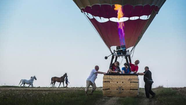 Perfekt liefen dagegen über eine Stunde lang die Vorbereitungen, bis die Gondeln für die Passagiere abgeladen, die riesigen Stoffhüllen mit Hilfe von mächtigen Ventilatoren aufgeblasen, die hunderte Kubikmeter Luft darin so weit aufgeheizt waren, dass die Fluggeräte bereit waren zum "Take Off", und dann an diesem traumhaften Septemberabend wie aus dem Bilderbuch in Richtung Westen dahinglitten.