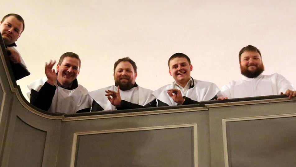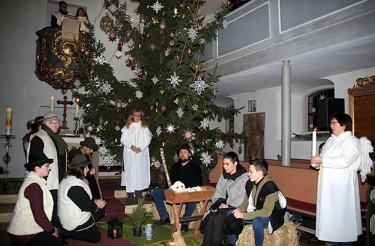 Den Part des Engel Gabriels übernahm Organist Heinz Beland. Bei seiner Herbergssuche wurde das Paar erst von den Wirten Otto Vetter und Axel Poek abgelehnt, bis ihnen Hirtenbub Hans alias Jona Thein den Platz im Stall vermittelte. Dort machten dann die Hirten (Kerstin Thein, Christine Schuhmann, Ronja Brunn, Karin Röder, Carola Vetter, Marcel Eckstein) dem neugeborenen Jesuskind ihre Aufwartung. Und während Susanne Dietz und Susanne Heubner als Engel im Kirchenraum stumm blieben, erklang hoch oben von der Empore ein ganz besonderer Engelschor: Unter der Führung von Pfarrer Knötig als aktuellem Interims-Dirigenten intonierten die weiß gewandeten Sänger des "Liederkranzes" Heilgersdorf die Choräle "Heilig heilig heilig" (Franz Schubert) sowie "Heilige Nacht" (Johann Friedrich Reichardt). Für die Kostüme zeichneten sich Nora Knötig und Yvonne Berust verantwortlich, für Aufnahme und Licht Roland Schumann.