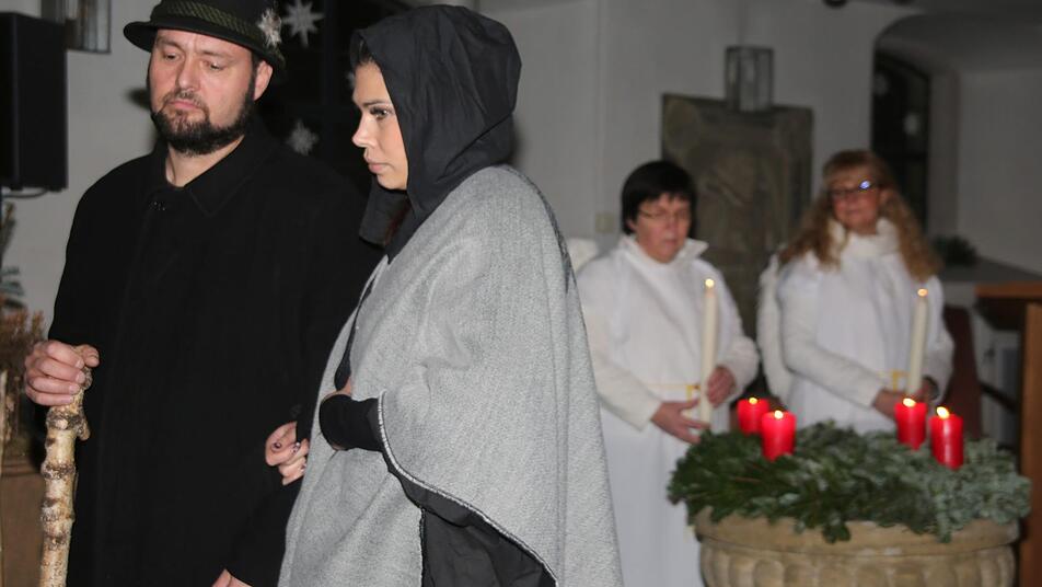 Auf den Aufruf im Seßlacher Amtsblatt und im Gemeindebrief "Sämann" hin hatten sich 14 Erwachsene und zwei Jugendliche auf das "Wagnis" eingelassen, wie es Knötig bezeichnete. Angeführt wurde die Riege der Darsteller von Eva Lotte Braunreuther als Maria und Ullrich Schmidt als Josef. Das Stück stellte Maria in den Mittelpunkt: "Sie sagt Ja zu Gottes Auftrag und wird dann zum Zeichen der Liebe Gottes in der Welt, die Sehnsucht erfüllt und Leben heilt", schildert Knötig. Nach dieser Liebe, "so schlicht und einfach, aber so ehrlich und wahrhaftig", suchten die Menschen auch heute noch, meint er. Von der Kanzel verkündeten Petra Grell und Hans-Karl ("Joe") Schleicher als "Engel des Spruches" bzw. "Engel der Schrift" die frohe Botschaft. "Das Volk, das im Finstern wandelt, sieht ein großes Licht", begann das Stück, "und über denen, die da wohnen im finstern Lande, scheint es hell."