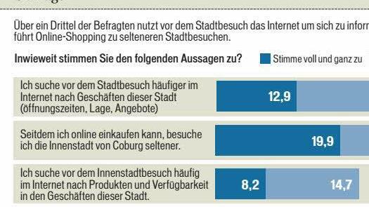 Offenbar wurde, "dass die meisten der Bürger gerne in die Innenstadt kommen". Über ein Drittel der Befragten nutzen danach vor einem Innenstadtbummel das Internet, um sich über die Angebote des lokalen Handels zu informieren. Ein Viertel kommt mehrmals in der Woche in die Innenstadt, einmal pro Woche ist ein weiteres Viertel dort zu finden. Im Hintergrund, aber nicht minder wichtig ist nach den Worten der Coburger E-Government-Chefin, dass die Angaben, etwa von Telefonnummern oder Öffnungszeiten, auch stimmen. "Deshalb wird es nur noch eine große Datenbank geben."