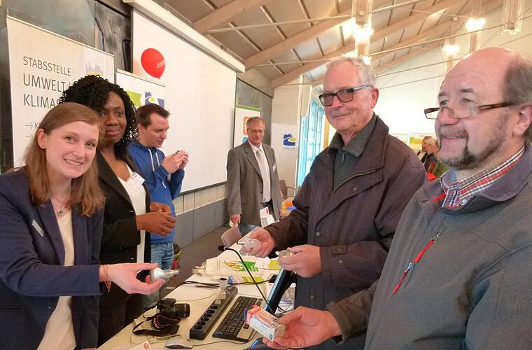 Absoluter Renner war die Glühbirnentauschbörse, bei der kostenlos eine alte Glühbirne gegen eine energieeffiziente LED- oder Energiesparlampe getauscht werden konnte. Lisa Güntner vom Landratsamt und Corine Wouappi Monthe (Master der Energietechnik) gaben sich alle Mühe, den Interessenten die Vorteile zu erläutern, so unter anderem die jährliche Einsparung von bis zu 50 Euro. Bereits durch minimale Verhaltensänderungen und kleine Neuanschaffungen, die sich meist schon nach wenigen Wochen oder Monaten bezahlt machen, ließen sich über das Jahr hinweg einige Kilowattstunden Strom sparen, erklärten sie.