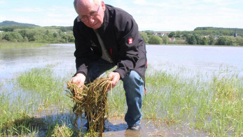 Einige Wiesen stehen noch mit hohem Gras unter Wasser - eine Seenlandschaft, aber ohne jegliche Idylle, denn auch dieses Gras taugt nicht mehr als Futtermittel: "Selbst wenn es trocknet, ist es schon viel zu alt und voller Dreck", sagt Ehrlich. Für viele Landwirte ist der wichtige erste Schnitt, der das beste Futter liefert, und damit die Qualität, dahin. Auf einen guten zweiten können sie nur hoffen.