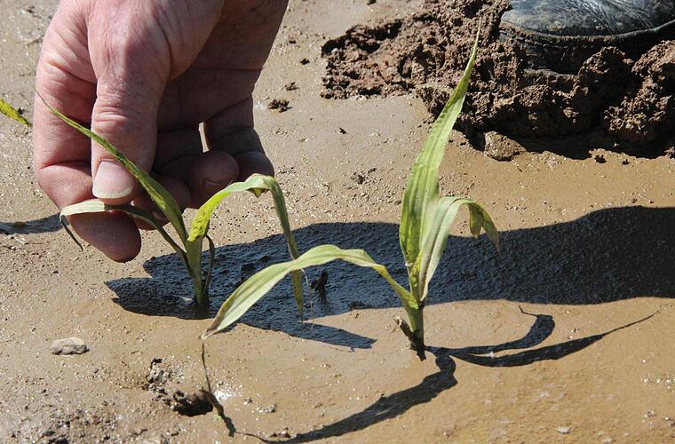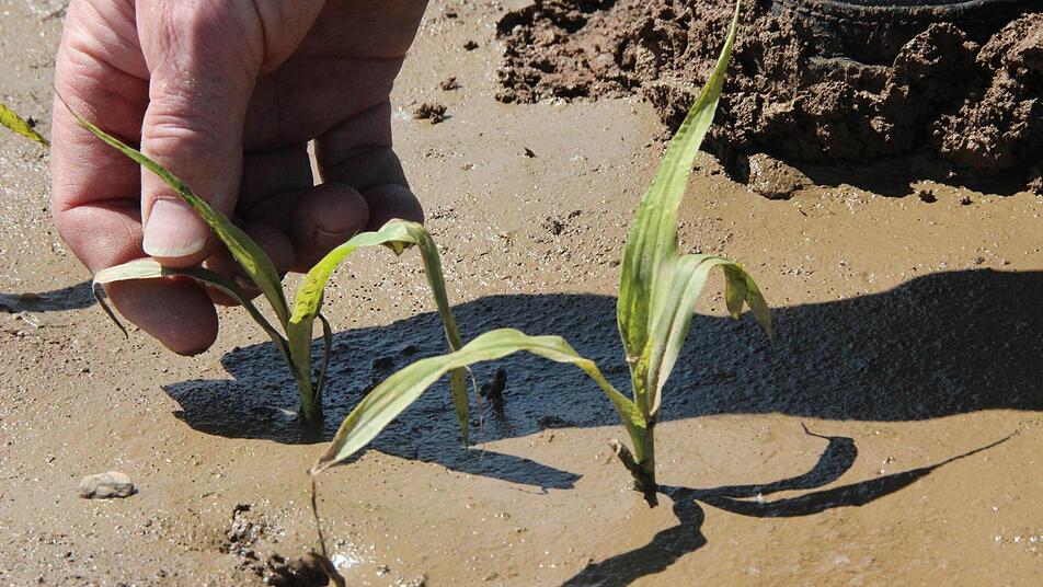 Die schlechte Qualität oder stellenweise der ganze Verlust von Grünfutter ist eine Folge von Regen und Hochwasser. Eine andere ist auf der gegenüberliegenden Straßenseite zu sehen. In leichter Hanglage, ein Feld mit gelblichen, rund zehn Zentimeter kleinen Pflänzchen. Wasser ist keines drauf, aber der Boden sieht schlammig aus. Dieser Eindruck bestätigt sich beim Betreten.