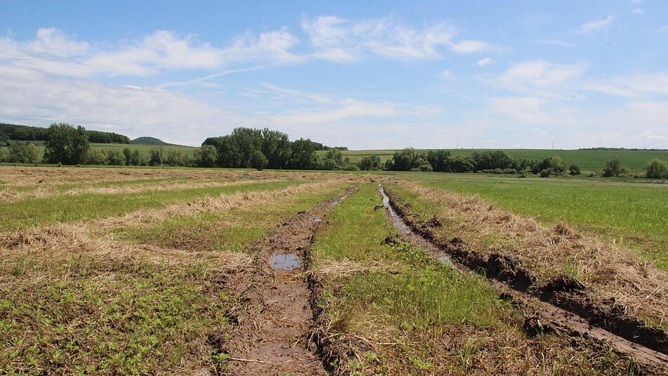 Tiefe Furchen von breiten Reifen im Wiesenboden, das sind die Spuren der Rettungsaktion von Dietmar Herr. Aber sie kam zu spät. Die Abdrücke stammen aus der Pfingstzeit, seitdem konnte Herr seine Fläche zum Grünfutteranbau an der Kreisstraße zwischen Rossach und Buchenrod nicht mehr betreten, geschweige denn bewirtschaften. Selbst nach dem Ende des Dauerregens, in dieser Woche, ist dies nur mit Gummistiefeln möglich.