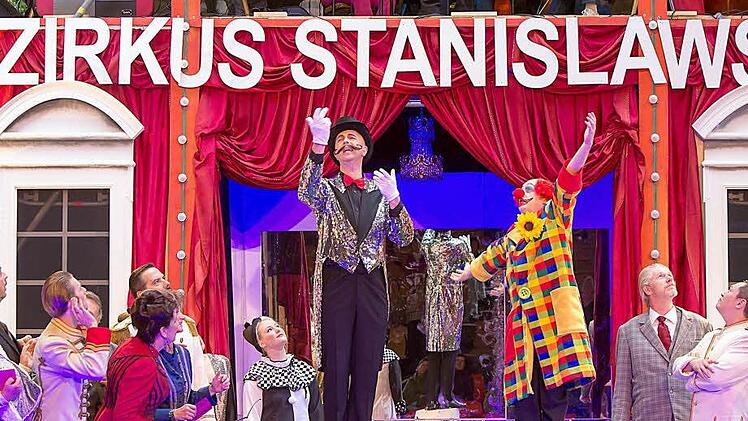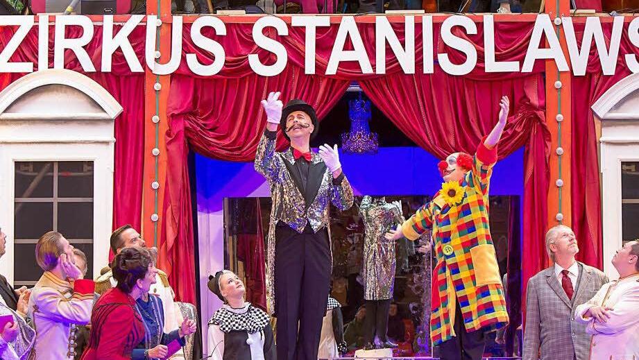 Die Musiker sitzen nicht wie üblich seitlich im vertrauten Orchesterpavillon, sondern thronen regelrecht in der Mitte des Bühnenbildes - direkt über dem Haupteingang zum Zirkus. Das ist optisch eine gelungene Lösung, die dem Dirigenten freilich Schwerstarbeit abverlangt, weil er kaum Blickkontakt zu den Sängern aufnehmen kann.