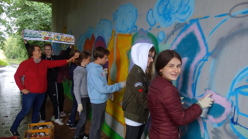 Sie gestalteten kunstvoll ein Themen-Graffito gegen Rassismus an einer Wand der Wege-Unterführung Willy-Hussong-Straße in der Nähe der HUK-Coburg - und das Ganze völlig legal. Die Aktion war zunächst an der Schulmauer in der Gymnasiumsgasse am Casimirianum geplant, das Vorhaben war jedoch wegen Bauarbeiten der Stadt Coburg derzeit nicht möglich ist.