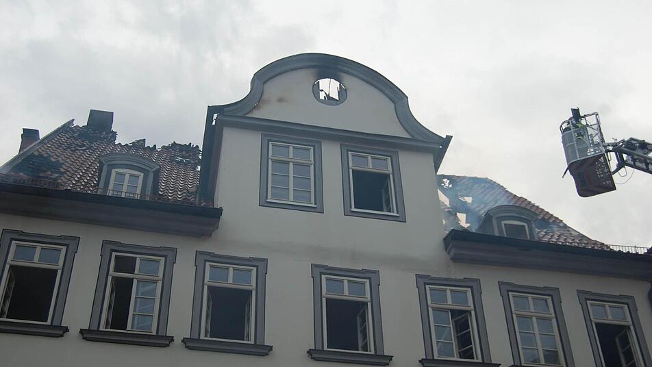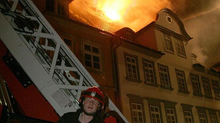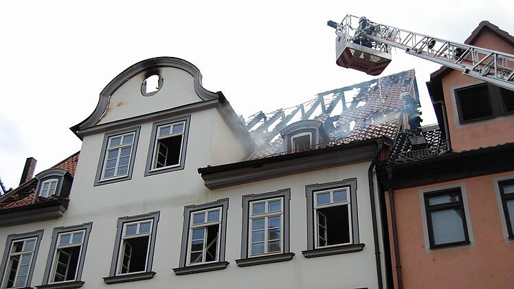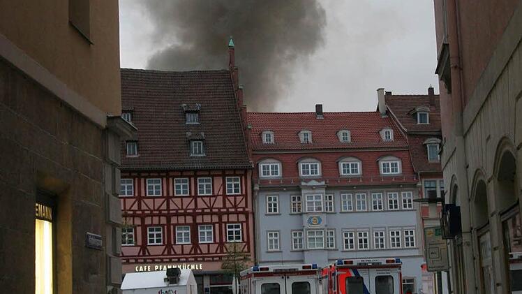 Mit Drehleitern, die in der Steingasse, der Rückertstraße und der Herrngasse aufgestellt wurden, versuchten die Feuerwehrleute, zum Brandherd vorzudringen.