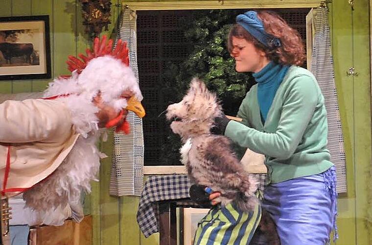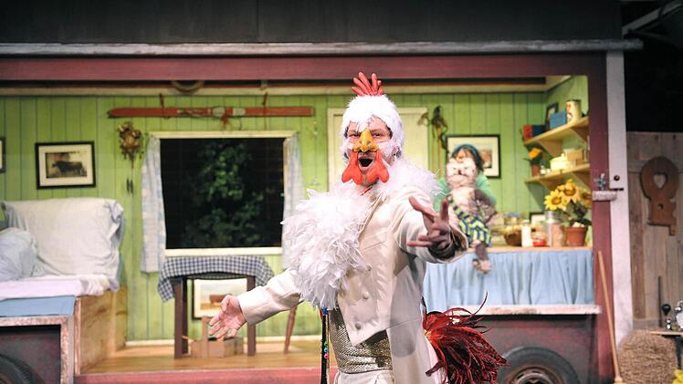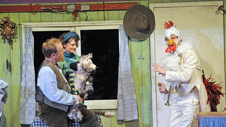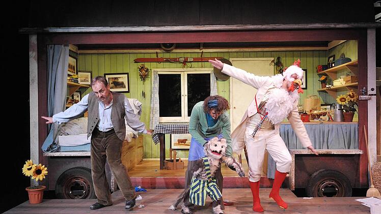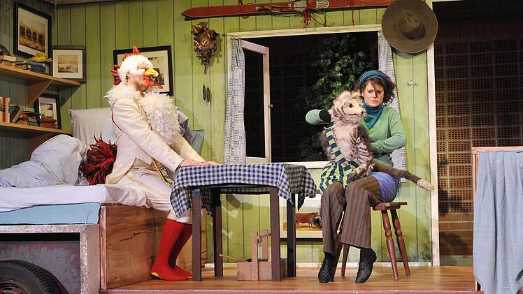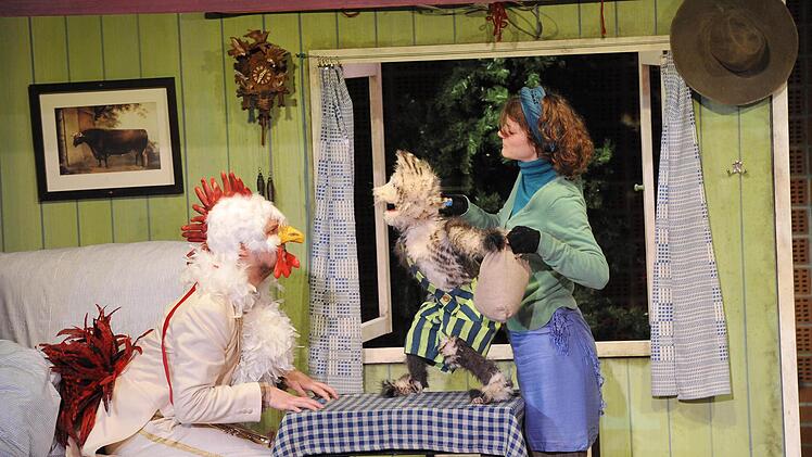 Zuvor gab's Zoff zwischen dem aufmüpfigen Kater Findus und dem unglaublich gockeligen Caruso (Oliver Baesler). Die puppigen Hühner sind da schon längst in Deckung gegangen in diesem herzigen, großen Puppen- und Menschenhaus. (Ausstattung Till Kuhnert).