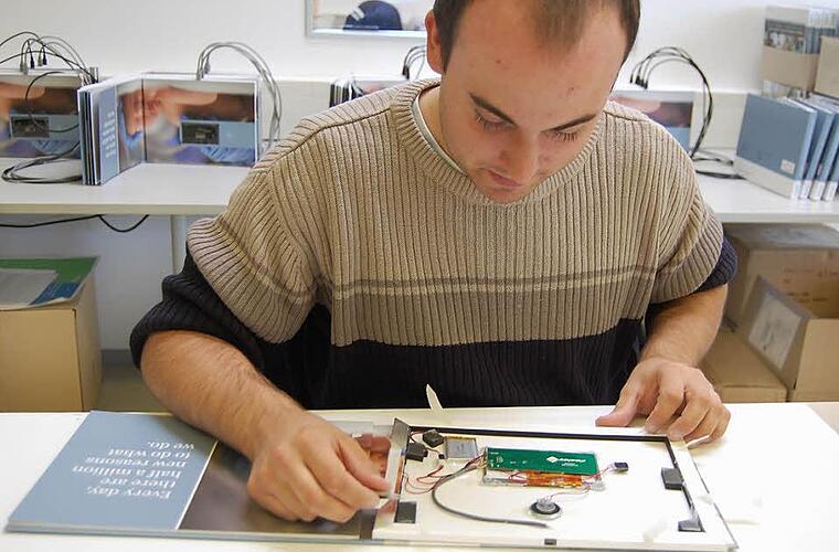 Und heute? Audio Logo "bastelt" unter anderem multimediale Geschäftsberichte und Imagebücher. "Gerade führen wir einen Auftrag für Siemens HealthCare in Erlangen durch", sagt Bardin und deutet auf einen langen Tisch, auf dem gerade Bücher elektronisch aufgeladen werden. Es sind sogenannte Imagebücher mit eingebautem Bildschirm. 10 000 Stück haben die Erlanger in Auftrag gegeben, ein echter Großauftrag für die kleine Firma in Ummerstadt.