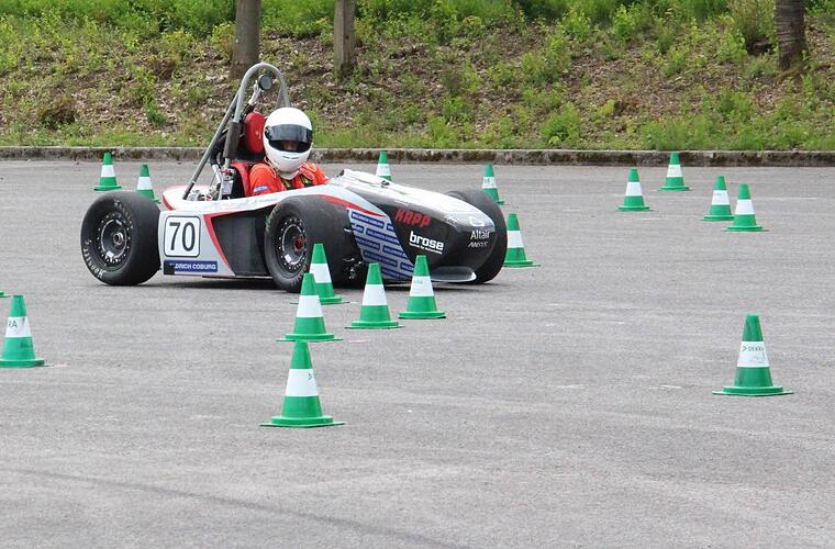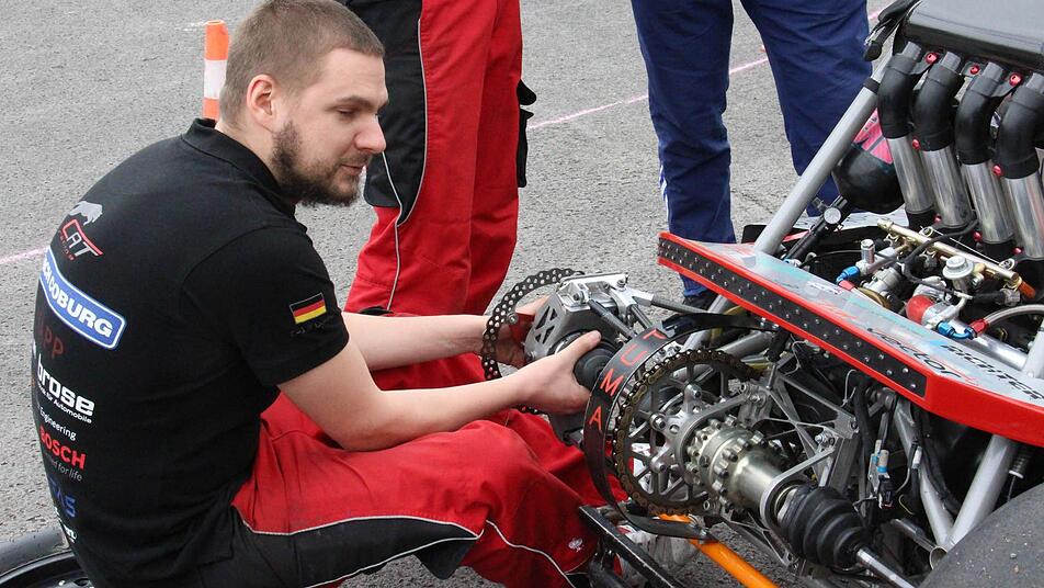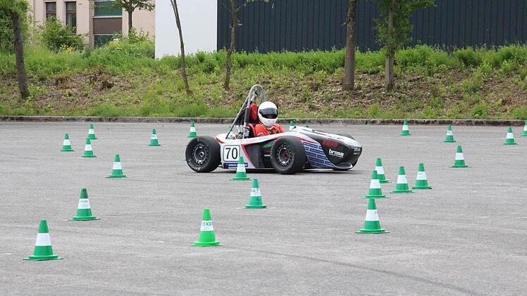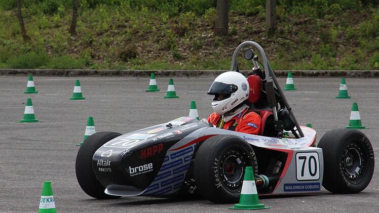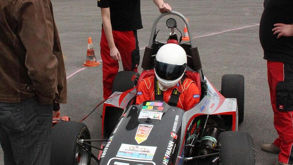 Am Steuer sitzt Sven Grosch, im richtigen Erwerbsleben bei Waldrich zuständig fürs Marketing. Weil Waldrich alljährlich das Coburger Automobil Team (CAT) der Hochschule unterstützt, darf Grosch sich für eine Viertelstunde als Rennpilot fühlen. "Stark!", sagt er anerkennend, als er aussteigt. Wie in der Formel 1 muss erst das winzige Lenkrad herausgehoben werden, damit der Fahrer sich aus dem Sitz schälen kann. "Die Lenkung ist ein bisschen starr", sagt Grosch, während das Team den Boliden für den nächsten Start klarmacht. Aber Servolenkung gibt's hier nicht, das Auto ist reduziert auf das Wesentliche.