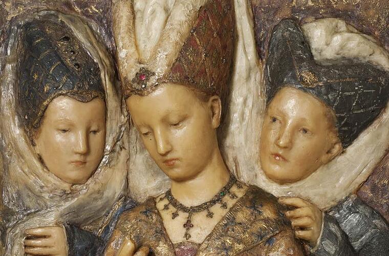 Was genau es zu bedeuten hat, ist schwer zu sagen, aber erstens ist das so bei den Symbolisten und zweitens passt das neu erworbene Kunstwerk auf der Veste bestens in das historische Ambiente des Fürstenbaus: ein seltenes Wachsrelief des französischen Symbolisten Henry Cros (1840-1907), "Die drei Zauberinnen", das aber womöglich erst "Das Horoskop" hieß, was aber auch nicht erklärt, warum hier die Göttin der Blüte, Flora, Circe und Medea versammelt sind und was sie treiben.