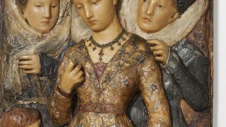 Coburg, Carl Eduard, gestalteten Ambientes, erklärt Klaus Weschenfelder. Im Bestand der Kunstsammlungen schlägt das Relief eine Brücke zwischen der von Joseph Graf Deym von Stritez (1752 - 1804) aus farbigem Wachs geschaffenen Portraitbüste von Prinz Josias von Sachsen-Coburg-Saalfeld aus dem Jahr 1794 und den Pâte-de-Verre-Arbeiten von Henry Cros aus den 1890er Jahren. Ergänzt wird das Thema durch das Portraitrelief der Tänzerin Cléo de Mérode (1875 - 1966) von Georges Despret (1862 - 1952) in gleicher Technik.