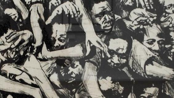 Darin sind so unmittelbar eindringliche und politisch aktuelle Werke wie Petra Katharina Engels "Rückkehr (?) nach Aleppo", Christian Bolds (durchaus auch propagandistisch falsch deutbare Attentäter?)-Linolschnitte "They don't hear you, if they don`t fear you", und Bernd Koblischeks furchtbar anklagende, große Flüchtlingsbilder "...aus dem Meer" und "Modern Times", in dem afrikanische Gesichter und Gliedmaßen gepfercht übereinander liegen wie die Knochenberge der deutschen Konzentrationslager. Das Flüchtlingsthema, das Trauma unserer Zeit, taucht bei weiteren Künstlern auf.