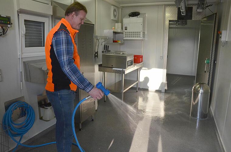 Eine Winde vor dem Eingang erleichtert es, das Wild aus dem Auto zu heben. Im Inneren finden die Jäger eine Einrichtung wie in einem Fleischerbetrieb vor. Edelstahlausstattung, warmes Wasser, Zerwirkbesteck - sogar eine Waage ist so installiert, dass der Jäger das Wild gleich an der Transportschiene wiegen kann. Mit der technischen Ausstattung wird das Aufbrechen und Zerwirken des Wildes sehr erleichtert. Schließlich können vor allem Wildschweine beachtliches Gewicht auf die Waage bringen. "Wir wollen mit der Einrichtung auch Anreize schaffen, dass die Jäger noch stärker auf Schwarzwild jagen", erklärt Norbert Seitz.