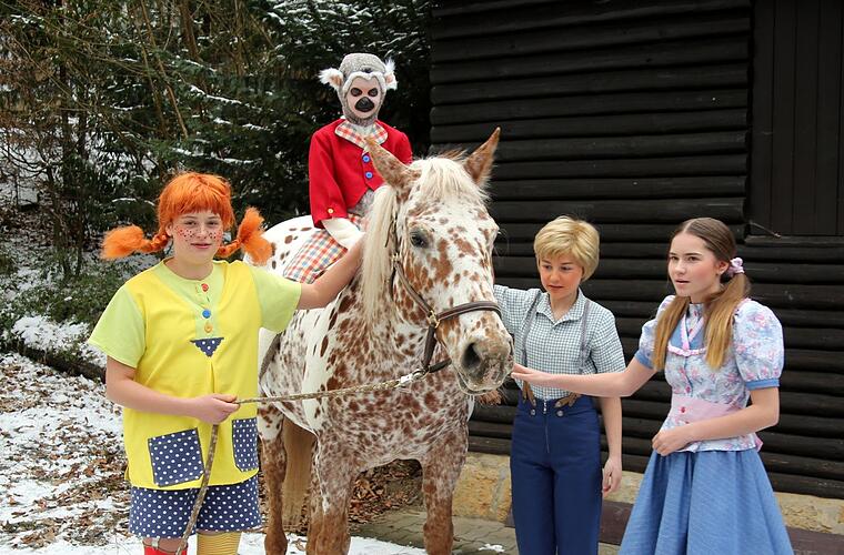 In den nächsten Wochen sollen sich Darsteller und Pferd behutsam aneinander gewöhnen, etwa durch gemeinsame Spaziergänge. Drei weitere Zwölfjährige gehören zum Ensemble: Nora Schneider mimt Pippis Freundin Annika, Amelie Künstler spielt deren Bruder Tommi und die erst zehnjährige Laura Herzer "Herrn Nilsson", Pippis Totenkopfäffchen. Widerstandslos und geduldig lässt sich "Spotty" mit den vier Darstellerinnen in ihren Kostümen fotografieren. Wie geplant, kann "Pippi" schon beim ersten Beschnuppern das Pferd an der Leine führen und "Herr Nilsson" auf seinem Rücken Platz nehmen. Bedenken hat Spottys Besitzerin nur, falls es lauter zugeht, wenn etwa Kinder schreien oder lang applaudiert wird. "Darauf müssen wir dann das Publikum eventuell hinweisen", meint Schneider. Der Kraftakt, den die Film-Pippi vollführt, wird Frida - und auch Spotty - übrigens erspart bleiben: "Nein, unsere Pippi muss ihr Pferd nicht in die Höhe stemmen", stellt die Regisseurin gleich klar.