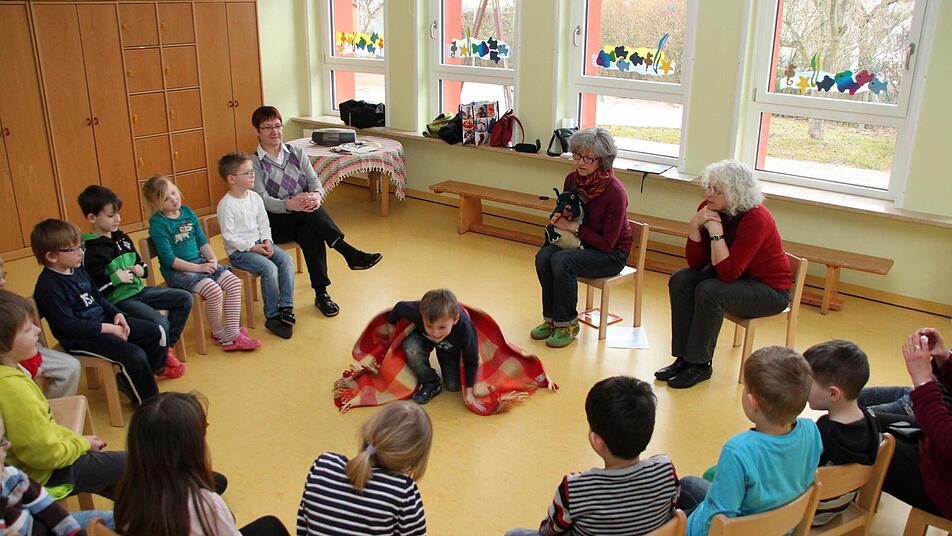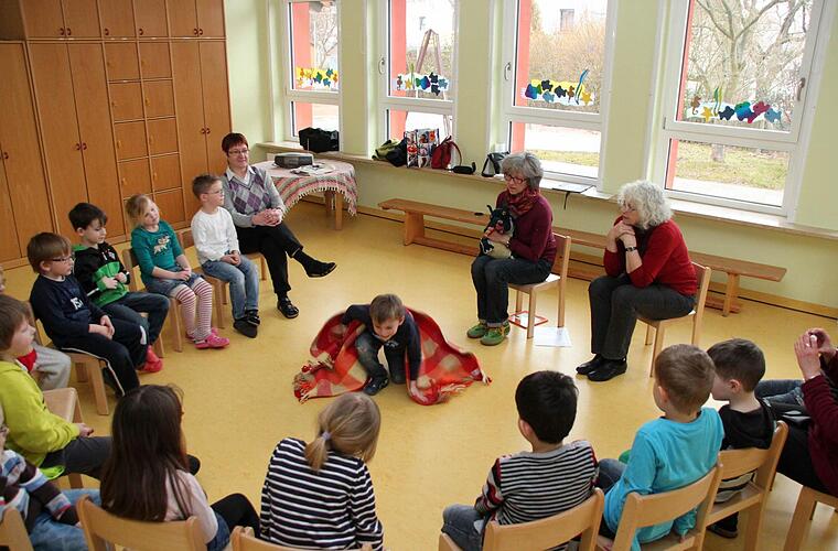 "Dino, Dino komm' heraus, wie sieht dein Gefühl heut' aus", rufen 13 Kinder im Vorschulalter in der evangelischen Kindertagesstätte Löwenzahn. Der kleine Marcel wirft eine karierte Decke, die die Höhle eines Drachen ist, von sich und streckt seine beiden Hände von der Brust weg. Eines der Mädchen ruft: "Der will nicht gestört werden." Marcel geht noch eine Runde durch den Stuhlkreis und behält seine Körperhaltung bei. "Ja das stimmt. Marcel möchte mit seiner Körperhaltung ,Stop, ich will das nicht' sagen", erklärt Anni Schuhmann-Demetz den Kindern. Sie ist gemeinsam mit ihrer Kollegin Sybill Kosenda von Coburg in den Neustädter Kindergarten gekommen.