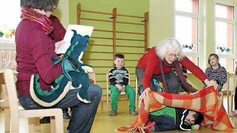 Fridolin kriecht mit Schuhmann-Demetz unter die Decke und flüstert Bruno ein Gefühl zu, dass er danach den anderen zeigen soll. Er wirft die Decke weg und grinst. "Er ist fröhlich", ruft ein Mädchen. "Was meinst du Fridolin", fragt Schuhmann-Demetz den grünen Drachen. "Ja, das ist richtig, Fridolin hat auch genickt." Die Kinder freuen sich und rufen laut: "Ja". Zuvor haben sie in einem Bilderbuch verschiedene Gefühle kennengelernt. Was hier spielerisch den Kindern vermittelt wird ist sehr wichtig und ein ernstes Thema, so Schuhmann-Demetz.