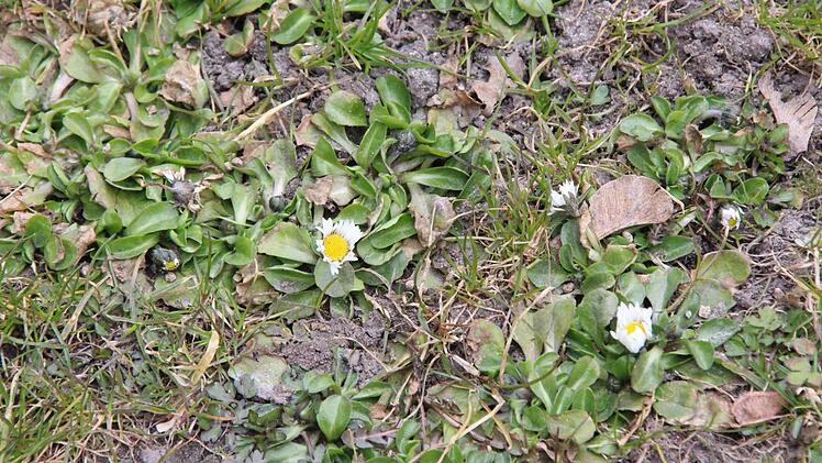 Zum Beispiel im Hofgarten: Da strecken tatsächlich noch Hartriegel ihre Köpfe durchs dürre Laub. Die gelben Blüten haben zwar schon einen leichten Frostschaden, aber sie halten aus. Neben der Ehrenburg staksen einige Tauben durchs Gras, und, siehe da: Es gibt sogar ein paar Gänseblümchen.