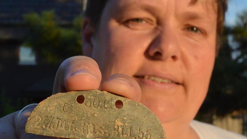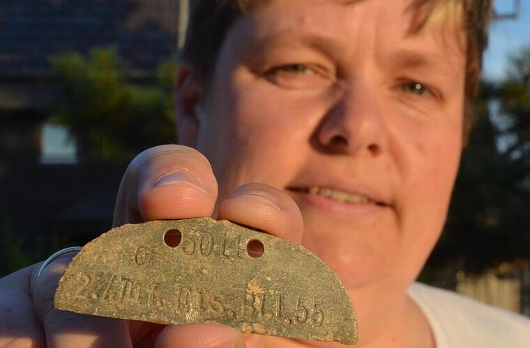 Das auffällige Stückchen Blech fiel Kerstin D. sofort auf. Es war bei der Gartenarbeit plötzlich zwischen den Erdbrocken aufgetaucht. Nachdem sie ein paar Erdreste entfernt hatte, wurden eingeprägte Buchstaben sichtbar. Ihr Ehemann Armin wusste, womit sie es zu tun hatten. Es war eine Erkennungsmarke für einen Soldaten. Genauer gesagt, die Hälfte davon. Ganz oben steht die Nummer 5014.