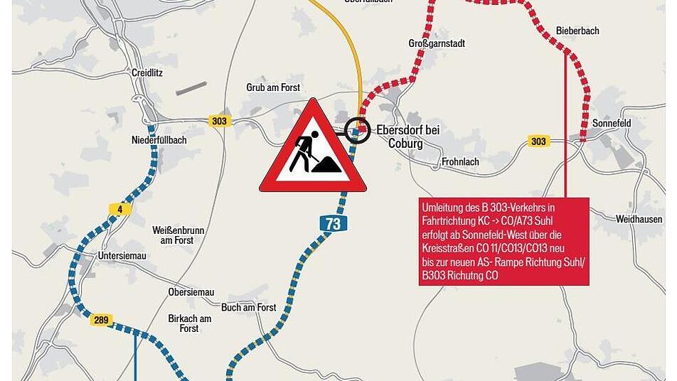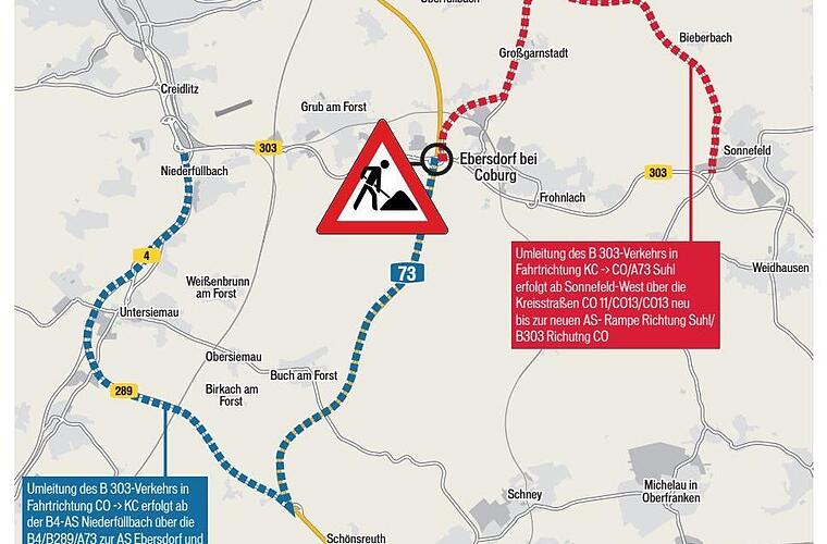 Fahrzeuge, die von Norden auf der A73 kommen und an der Anschlussstelle Ebersdorf ausfahren wollen, werden über die B 289, die B4 (Ziel Coburg) beziehungsweise über die Anschlussstelle Lichtenfels-West (Ziel Kronach ) umgeleitet.