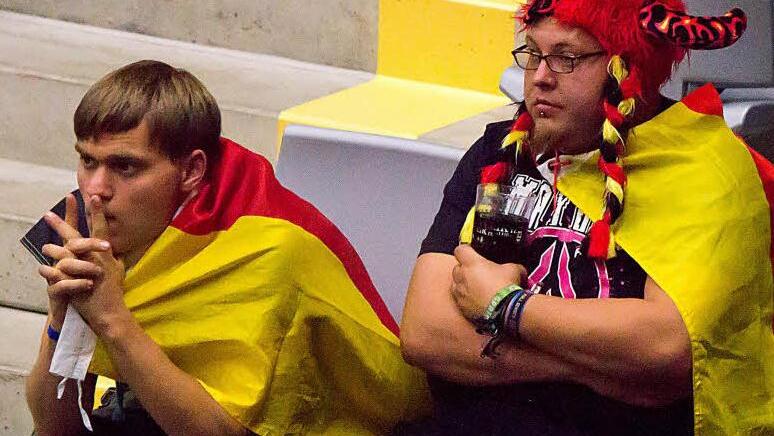 Mehr Tempo bitte! Richtig eingefleischte Fußballanhänger sind Florian Knoth aus Lautertal und Michel Günther aus Coburg. Ausgestattet in Schwarz-Rot-Gold fiebern sie mit, feuern an und jubeln begeistert. "Total aufregend und spannend", meint Florian Knoth in der Halbzeit. Dem pflichtet Michel Günther zwar bei, findet aber: "Die deutsche Mannschaft spart zu viel Kräfte, die sollten mehr Tempo geben." Auch wenn am Ende des Spiels das Wunschergebnis nicht erreicht wird, sind die Fans zufrieden. Florian Knoth: "Das war ein spannendes und faires Spiel."