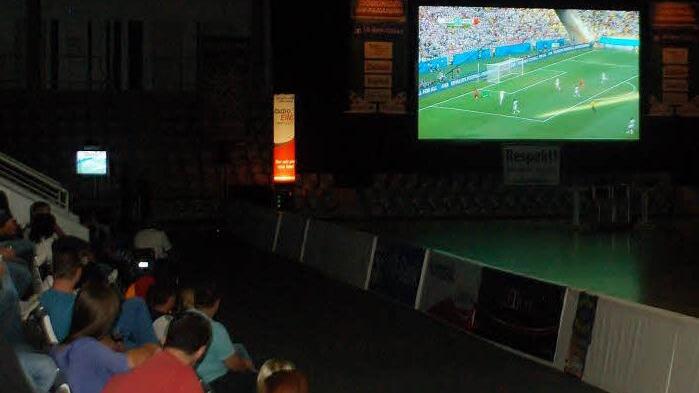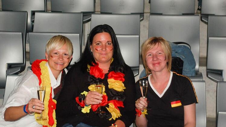 "Im Biergarten waren wir schon und jetzt wollen wir mal sehen, wie es hier ist", sagt Susanne Reichenbacher. Sie und ihre Arbeitskolleginnen Michaela Fischer und Mirja Küchenknecht haben es sich am Samstagabend mit einem Gläschen Sekt auf ihren Sitzen beim Public Viewing in der HUK-Arena gemütlich gemacht. Nun wartet das Trio bestens gelaunt auf den Anpfiff des Gruppenspiels Deutschland gegen Ghana, das auf einer 40-Quadratmeter-Leinwand übertragen wird.