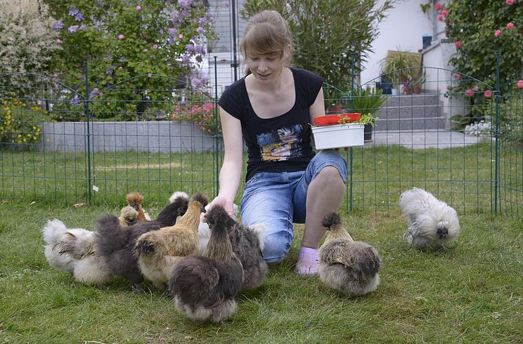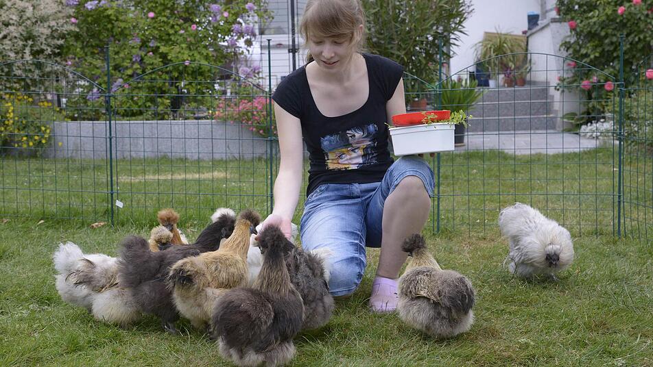 "Putchen, Putchen, Putchen" ... und Abigale sitzt Jessica schon fast auf dem Schoß. Abigale ist eins von 17 Zwergseidenhühnern, die Jessica Jonik aus Ebersdorf züchtet. Bekommt Abigale eine Weintraube, dreht sie sich auf Kommando im Kreis oder wippt auf einer kleiner Schaukel. "Sie ist mein Lieblingshuhn", erzählt die 19-Jährige, für die ihre Tiere fester Bestandteil der Familie sind.