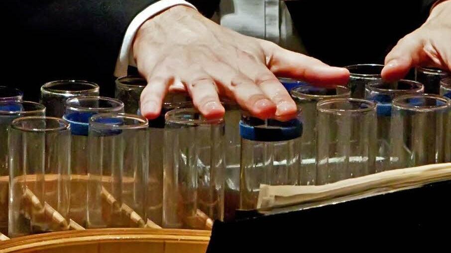 Das auch als Glasharfe bezeichnete Instrument bestimmt aus gestimmten Weinkelchen.
