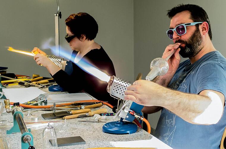 Glaskünstler bleiben lebenslang Lernende. Denn das Material, mit dem sie arbeiten, lässt sich auf faszinierend viele Arten bearbeiten und formen und hält auch für den erfahrensten Künstler immer wieder Überraschungen bereit. "Glas ist wie ein Mädchen, es erinnert sich an alles", sagt die kanadische Glaskünstlerin Karina Guevin. Gemeinsam mit Cédric Ginart ist sie als "Artist in Residence" im Lampenglasstudio des Glasmuseums in der Rosenau zu Gast - um dem Publikum ihre Arbeit im Entstehen zu zeigen und zugleich zu lernen.