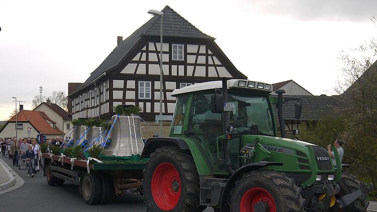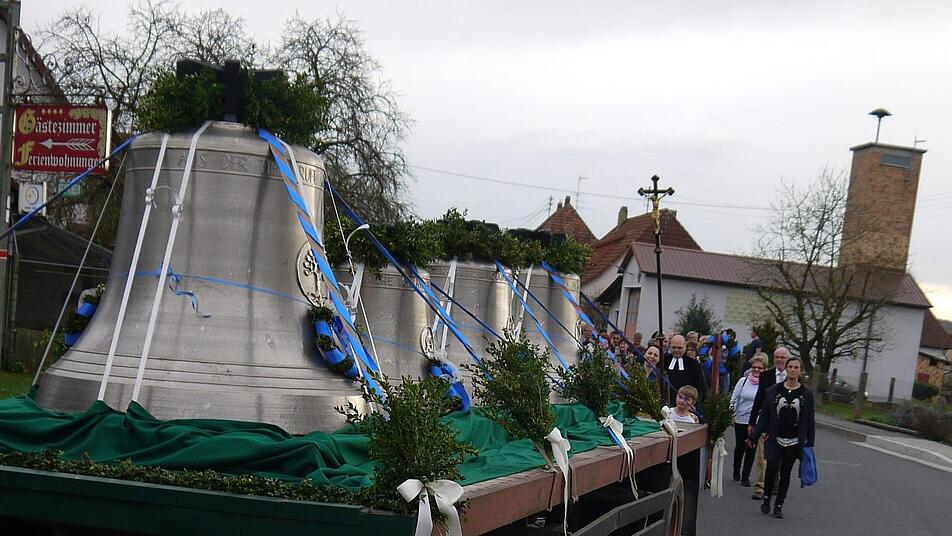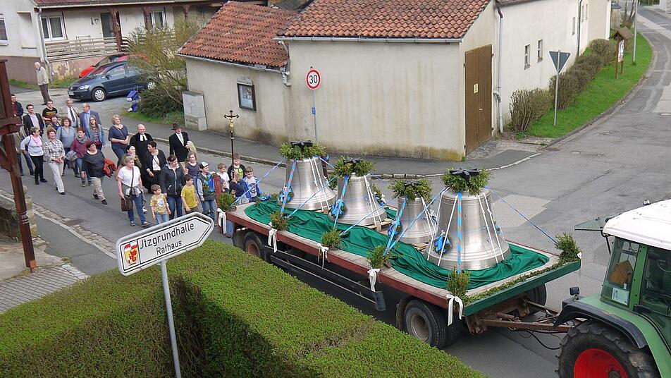 Nachdem ein Guss bei der Firma Rincker aufgrund von Problemen mit der Belüftung daneben ging und erhebliche Verzögerung beim Glockenprojekt auslöste, lief die die Lieferung von Hessen in den Itzgrund glatt. "Beim Abladen hatten wir ein bisschen Probleme, weil die Glocken sehr schwer waren", erzählte Albert Putschky. Bei über 1600 Kilo musste erst einmal ein großer Schlepper her, um die größte Glocke vom Liefer-Lkw herunter und auf den Anhänger für den Umzug verladen zu können. Quasi zeitgleich zur Anlieferung war Pfarrer Michael Bergner mit einer Firma an der Gleußener Kirche, um dort die alten Glocken per Schwerlastkran aus dem Dachstuhl zu holen. Auch da: keine nennenswerten Probleme. "Ein Schiefer ist uns kaputt gegangen, aber den haben wir gleich wieder repariert, damit die Kirche für den Umzug schön ausschaut", erzählte Michael Bergner.