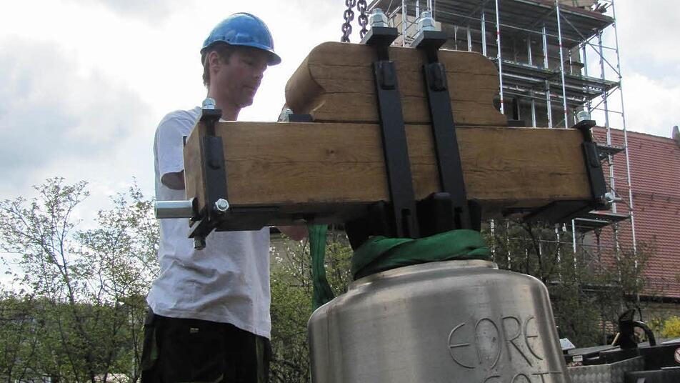 Die alten Glocken wurden aus dem Turm geholt, und Heinz Musiol und seine vier Mitarbeiter von der Firma Bayreuther Turmuhren zogen gleich nach der Demontage ihrer Vorgängerinnen die drei neuen Bronzeglocken auf den Turm hoch.