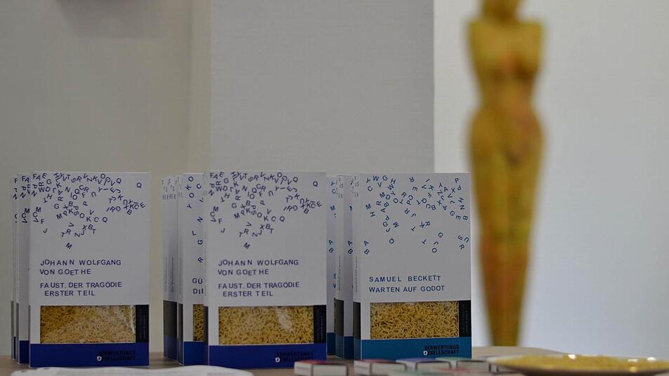 Ein Klassiker, der in keinem Bücherregal fehlen darf. Droschke und Heß haben den berühmten Titel vorne auf die Pappschachtel geschrieben. Im Inneren des Werkes spielt Gretchen freilich keine Rolle. Der Leser findet darin nur Nudeln aus Buchstaben. Aber das in Hülle und Fülle. "Unsere Bücher sind immer gleich dick", sagt Droschke während Heß bereits über einem neuen Werk brütet. Das Duo geht bei ihrer Arbeit immer gleich vor. Jeder Band der Weltliteratur wird mit einem Pfund guter, deutscher Buchstabennudeln hergestellt. Gerade arbeiten die beiden an ihrem zweiten Werk: Warten auf Godot von Samuel Beckett. Weitere Klassiker der Weltliteratur sollen in den nächsten Monaten folgen. "Wir wollen 100 Bände herausbringen. Das wird ein Mammutprojekt", freut sich Droschke und löffelt eifrig Suppennudeln in eine Pappschachtel.