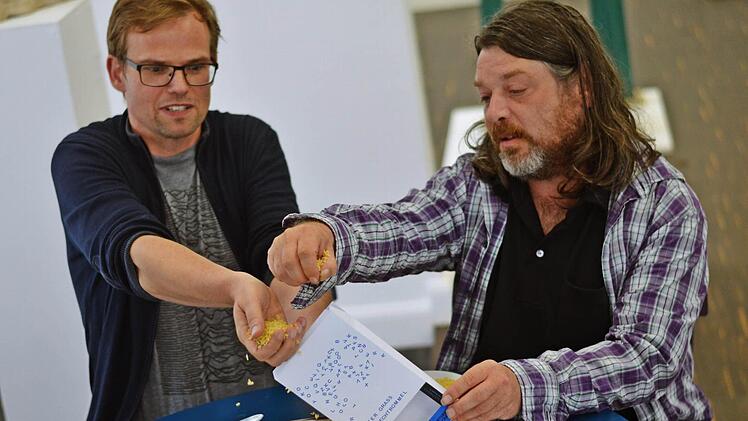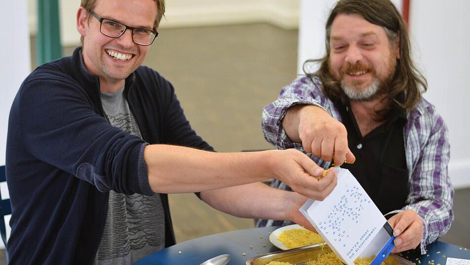 In ihrer Schreibwerkstatt wimmelt es von Buchstaben. "In den handelsüblichen Buchstabennudeln steckt das komplette Alphabet", sagt Martin Droschke und entleert eine Packung in einen tiefen Teller. Dann rührt er mit einem großen Löffel in dem Buchstaben-Salat aus Suppennudeln herum. Mit Argusaugen scannt er das Durcheinander aus Hartweizengrieß. "Hier ist ein A. Das ist ein E. Nur die Umlaute fehlen", sagt Droschke und beugt sich tiefer über den Teller mit den Buchstabennudeln. "Prinzipiell lassen sich alle Texte mit Buchstabennudeln schreiben", ist sich der Konzeptkünstler aus Coburg sicher. "Wir wollen dem Bildungsbürger mit unseren Buchstabennudel-Büchern den Spiegel vorhalten", sagt Oliver Heß und präsentiert stolz den ersten Band: Faust. Der Tragödie erster Teil von Johann Wolfgang von Goethe.