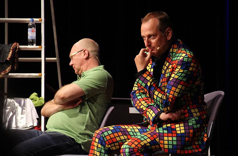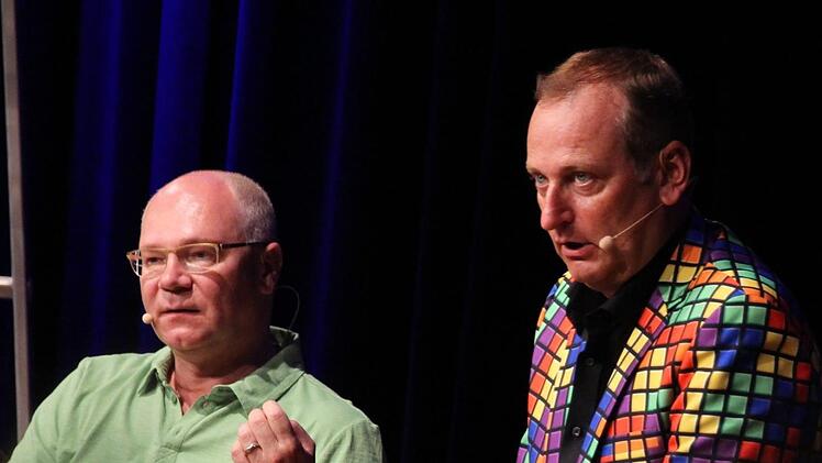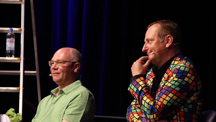 Das ist kein Negativurteil! Tolle Kabarettisten gibt es mittlerweile massenhaft, weiß der Volker Heißmann aus Förd bei Nermberch ganz genau. "Und die Tachesschau kannst nemmer dobben. Also machen mir kein Kabarett." Nä. Die beiden machen "a dolles Gschmarri", "und wennst hier naus gehst und sachst, allmächt wor des heid wieder blöd, dann war's gut."
