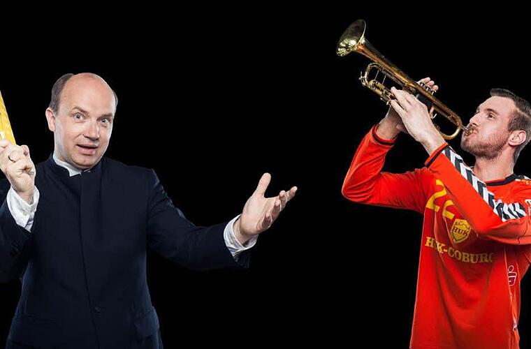 Sind HSC-Torhüter Oliver Krechel und Kreisläufer Dominic Kelm unter die Musiker gegangen? Als Trompeter und Geiger werben Krechel und Kelm jedenfalls im HSC-Trikot für ein ganz und gar außergewöhnliches Konzertprojekt. "Handball-Sinfonie" lautet das Motto für ein Event, das das Landestheater gemeinsam mit dem ambitionierten Handball-Zweitligisten HSC 2000 Coburg in der HUK-Arena planen.