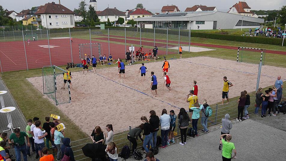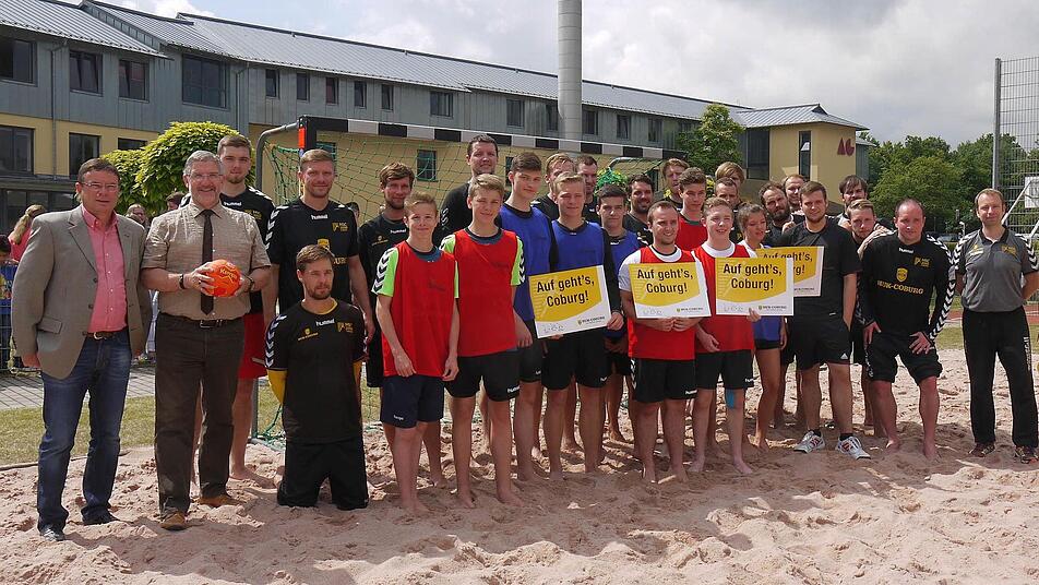 Mit einem Gastspiel der Coburger Handballer ist das Sand-Spielfeld neben der neuen Mensa am Neustadt Arnold-Gymnaisum wieder freigegeben worden.