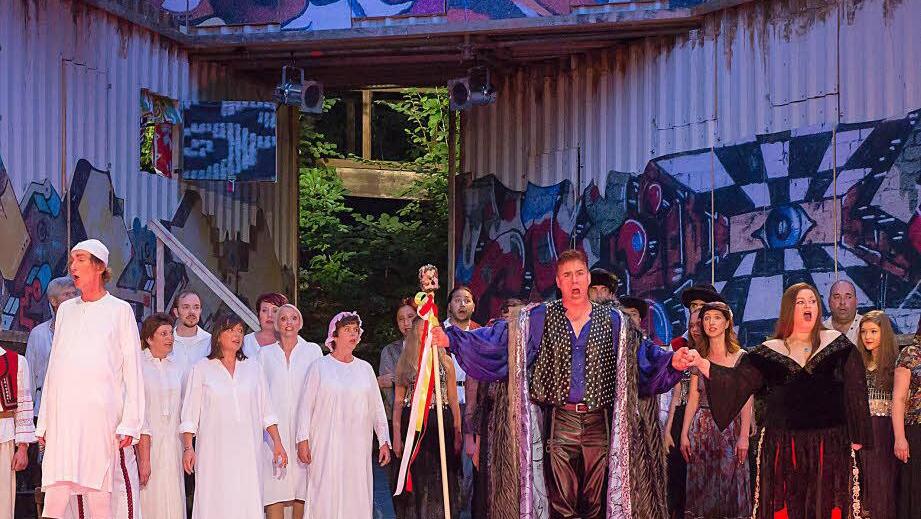 Nanu?! So hat das Publikum der "Coburger Sommeroperette" die Waldbühne in Heldritt noch nie gesehen. Mitten im idyllischen Grün vor der überdachten Zuschauertribüne hat Bühnenbildner Frieder Klein vier wuchtige Container schräg neben- und übereinander türmen lassen. Graffiti schmücken die tristen Außenseiten. Hier haust das fahrende Volk, das im Titel der Strauß-Operette "Der Zigeunerbaron" verewigt ist. Container statt Wohnwagen oder sonstiger mobiler Unterkünfte? Warum eigentlich nicht. Zumal Frieder Klein seinen Containern noch allerlei raffinierte Details spendiert hat - reichlich Klappen zum Beispiel, die flotte Szenenwechsel auf offener Bühne möglich machen.