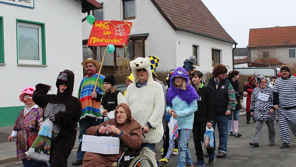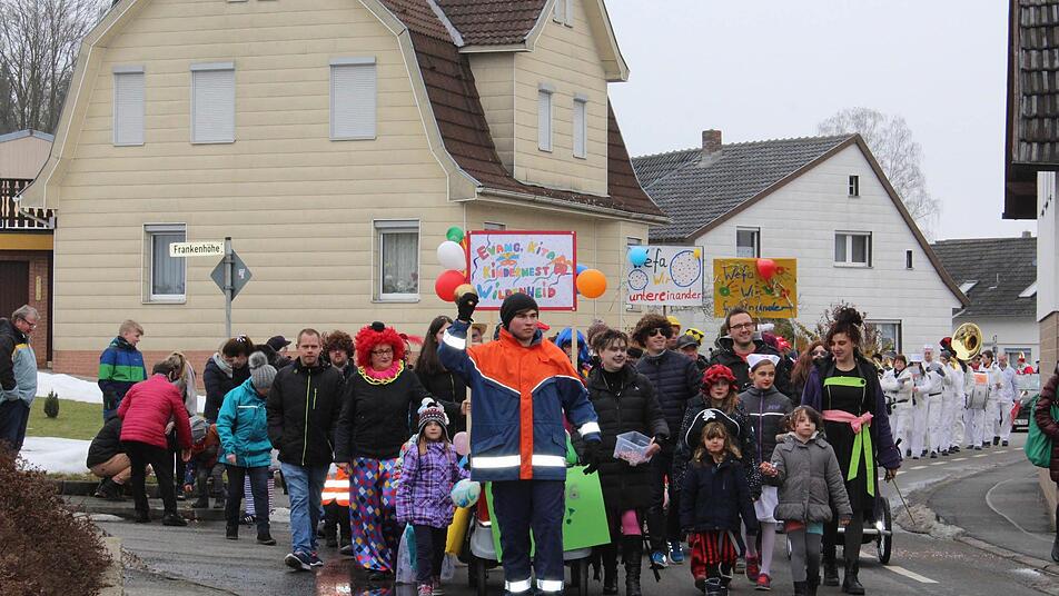 Von der Polizei eskortiert, zog das bunte Narrenvölkchen fröhlich durch die Gegend. Der "Ausläuter" führte den Zug an. Auch der war in der Neuzeit angekommen: Statt in alter Feuerwehruniform wie früher, bimmelte jetzt Felix Dötschel von der Jugendfeuerwehr die Gemeindeglocke zum Start im aktuellen Outfit. Ihm folgten die Kleinsten vom Wildenheider Kindergarten, kunstvoll geschminkt und verkleidet. Der BV als die Wildenheider Teufel hatten sich das 700-jährige Ortsjubiläum auf die Fahne geschrieben. So wusste gleich jeder, was in der Teufelsküche von Wildenheid los war. Die bunte Truppe der WEFA sprühte vor Fröhlichkeit und hatte ihre Freude, dass sich einfach alle freuten. Und diese Freude polierte der Spielmannszug Coburg-Neuses noch mächtig auf musikalischen Hochglanz!