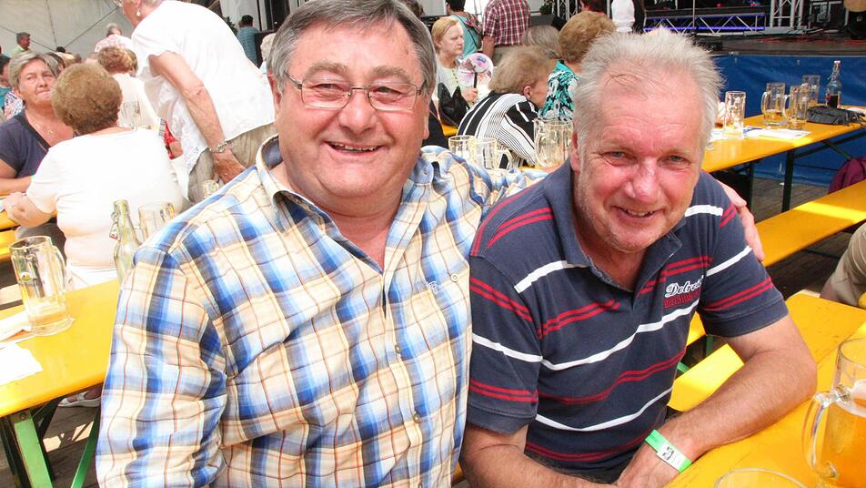 Martin Korte und Edgar Feßler, die seit 1950 befreundet sind und sich seitdem immer mal wieder auf solchen Events treffen, gefällt das Duo am besten. Doch auch Mario Bamberger und die Gaudi Buam haben die Freunde überzeugt. "Es ist sehr warm hier, doch sonst können wir uns nicht beschweren. Das Bier schmeckt gut, die Stimmung ist fantastisch - was will man mehr?", sagt Martin Korte. Das Festzelt selbst finde er sehr schön, auch wenn er es bedauere, dass es nicht ganz gefüllt ist.