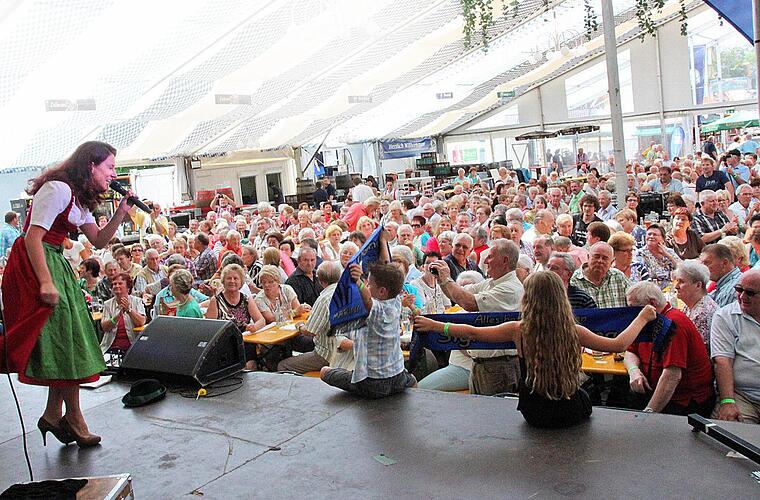 Mario Bamberger und seine Gaudi Buam heizen als erste dem Publikum ein. Und das im wahrsten Sinne des Wortes. Außerhalb des Zeltes herrschen so hohe Temperaturen, dass es innen richtig heiß wird. Doch das hindert Martin Kofler, einem Solokünstler aus Liechtenstein, nicht daran, die Menge zum Tanzen zu bewegen.