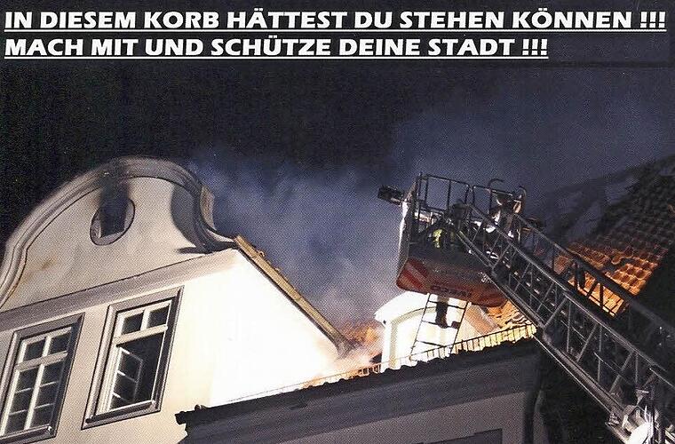 Fünf Stunden lang stand Sebastian Trautwein im Korb der Drehleiter und räumte Ziegel vom brennenden Dach in der Herrngasse. Mit seinem Bild wirbt die Coburger Feuerwehr.