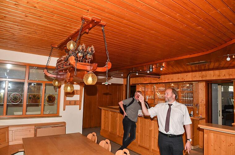 Den Rundgang durch den 1838 in seiner heutigen Form errichten "Stern" nutzt der Bürgermeister, um sich extra unter die alte Lampe mit dem Logo der "Stern"-Brauerei zu stellen und sichtlich amüsiert mit einem Gerücht aufzuräumen: "Die Lampe hängt noch hier und nicht in meinem Gartenhaus."