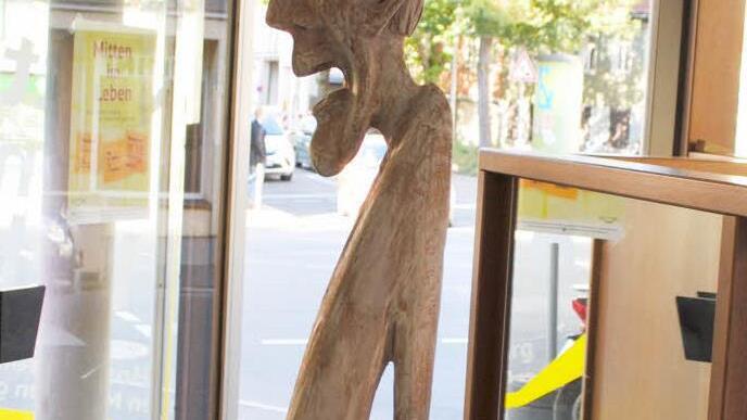 Zu all dem übrigens lachen die spindellangen Holzskulpturen des Steinacher Bildhauers Volker Sesselmann. Seine alten Leutchen stehen da hinter den Schaufenstern, neben den hier noch ganz unberührten Ruhekissen, vor den Bildern, grinsen, lachen sich kaputt über die da draußen auf der östlichen Lebens-Tangente der alten Stadt Coburg in ihren immer schickeren Auto-Mobilen Vorbeijagenden. Wonach hetzen sie denn alle?