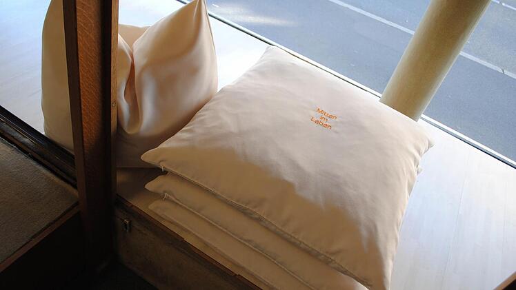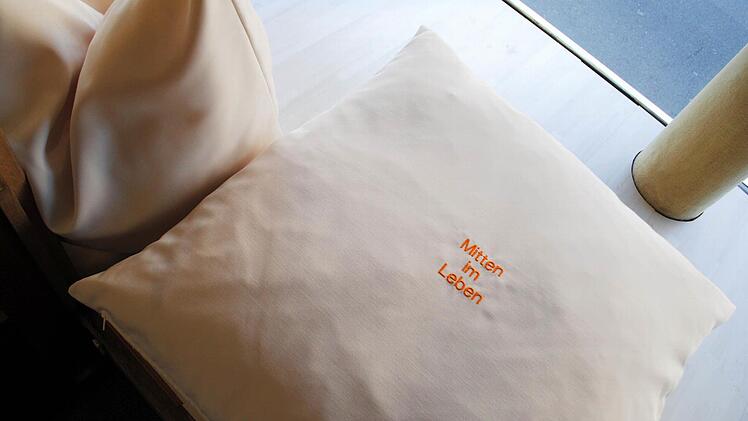 "Mitten im Leben" überschrieben - sind wir vom Tod umgeben, lautet die vielfach variierte Sentenz, die so formuliert nachweislich bis in die Zeit um 750 zurückreicht. Große Kissen, klein bedruckt mit diesen Satzteilen, hat der Gemündaer Innenarchitekt Josef Starkl um den Ausstellungsraum arrangiert.